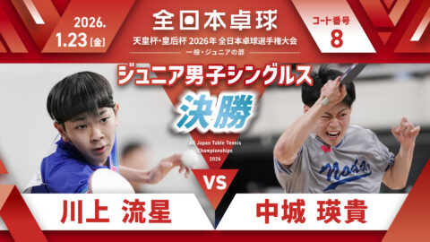 【見逃し配信】2026年全日本卓球選手権大会【4日目:1/23】:ジュニア男子決勝 川上流星 vs 中城瑛貴(コートNo. 08)