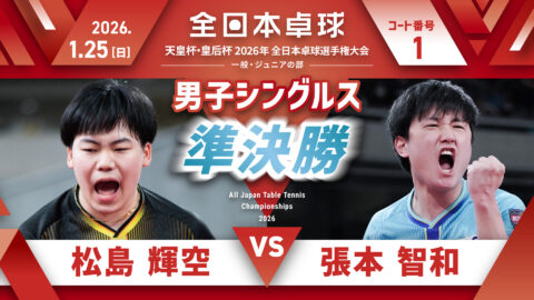 【見逃し配信】2026年全日本卓球選手権大会【6日目:1/25】:男子シングルス準決勝 松島輝空 vs 張本智和(コートNo. 01)