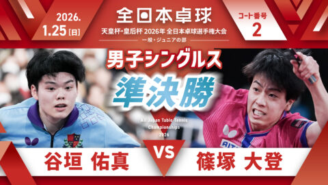 【見逃し配信】2026年全日本卓球選手権大会【6日目:1/25】:男子シングルス準決勝 谷垣佑真 vs 篠塚大登(コートNo. 02)