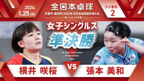【見逃し配信】2026年全日本卓球選手権大会【6日目:1/25】:女子シングルス準決勝 横井咲桜 vs 張本美和(コートNo. 02)