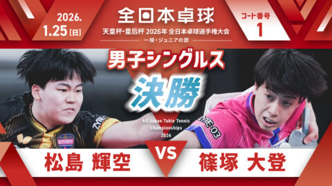 【見逃し配信】2026年全日本卓球選手権大会【6日目:1/25】:男子シングルス決勝 松島輝空 vs 篠塚大登(コートNo. 01)