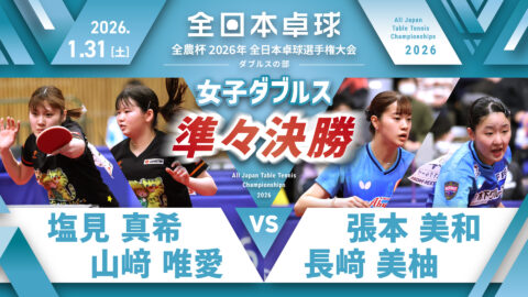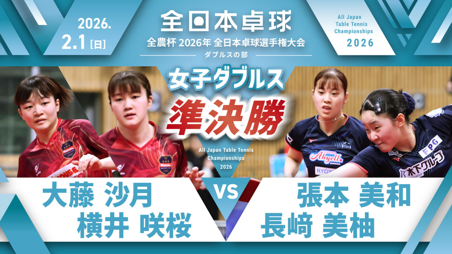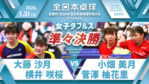【見逃し配信】2026年全日本卓球選手権大会(ダブルスの部)【4日目:2/1】:女子ダブルス準決勝 大藤沙月・横井咲桜 vs 張本美和・長﨑美柚(コート1)