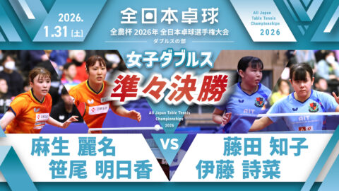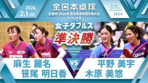 【見逃し配信】2026年全日本卓球選手権大会(ダブルスの部)【4日目:2/1】:女子ダブルス準決勝 麻生麗名・笹尾明日香 vs 平野美宇・木原美悠(コート2)