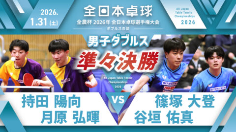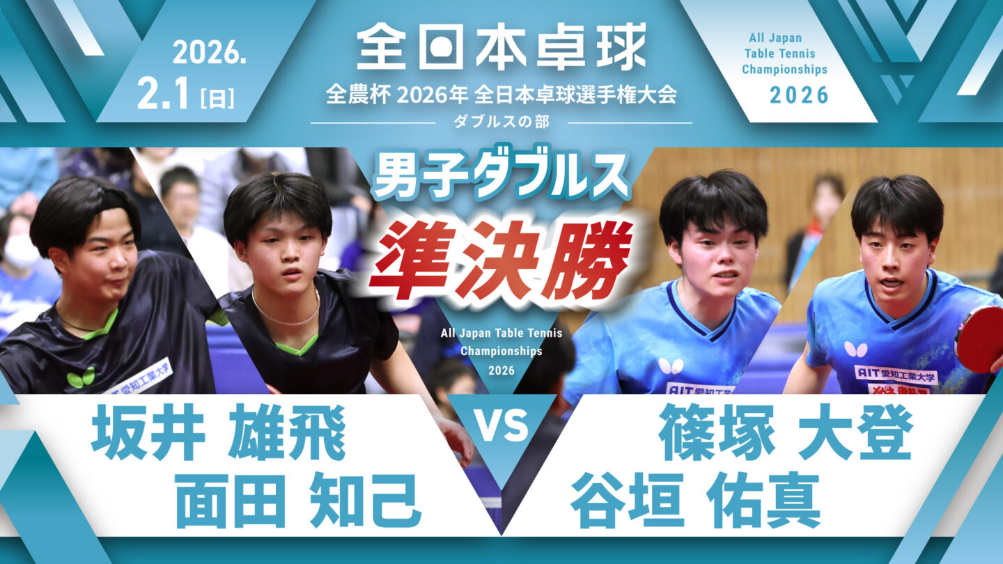 【見逃し配信】2026年全日本卓球選手権大会(ダブルスの部)【4日目:2/1】:男子ダブルス準決勝 坂井雄飛・面田知己 vs 篠塚大登・谷垣佑真(コート1)