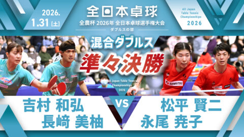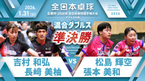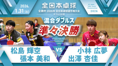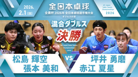 【見逃し配信】2026年全日本卓球選手権大会(ダブルスの部)【4日目:2/1】:混合ダブルス決勝 松島輝空・張本美和 vs 坪井勇磨・赤江夏星(コート1)