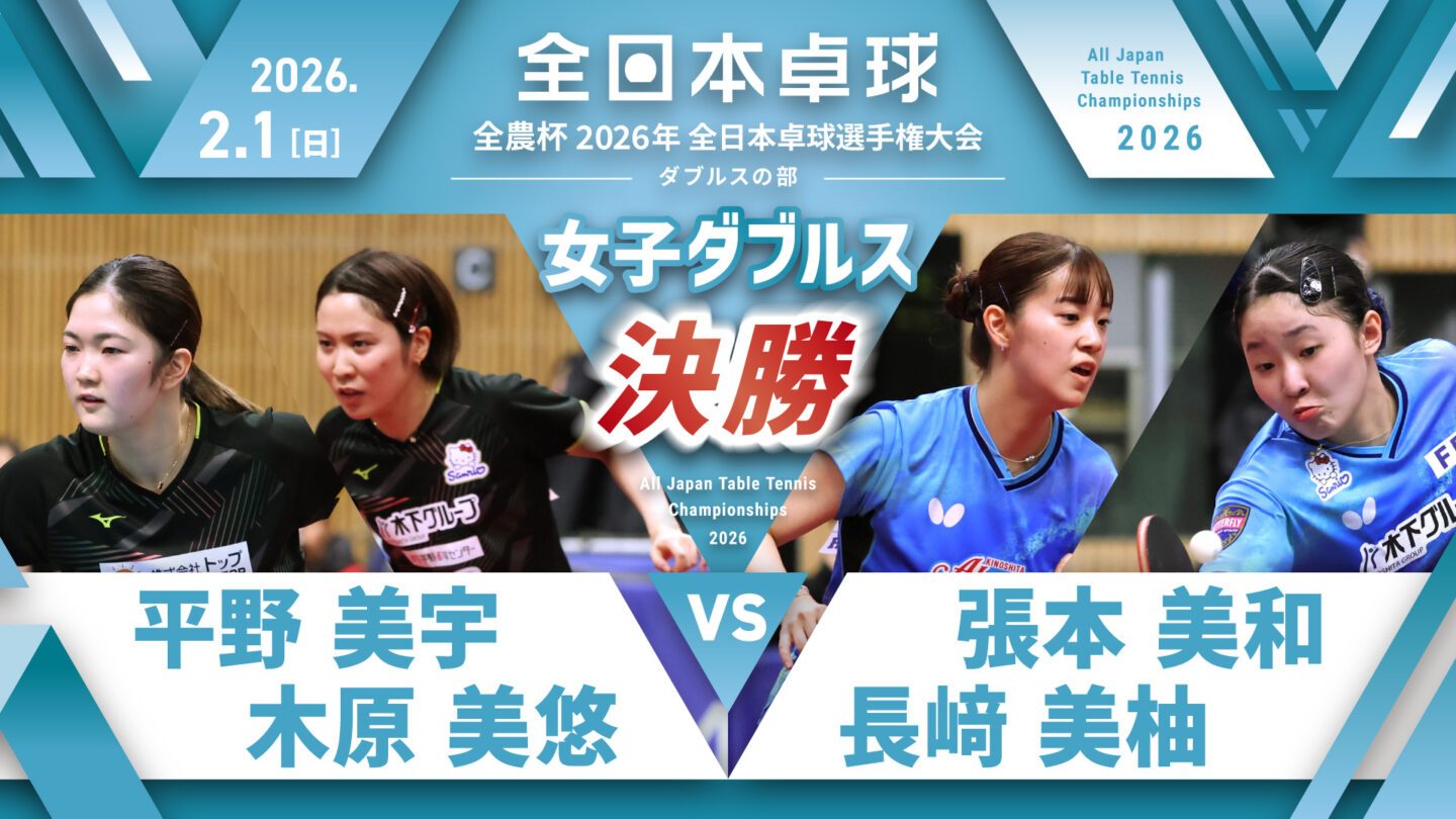 【見逃し配信】2026年全日本卓球選手権大会(ダブルスの部)【4日目:2/1】:女子ダブルス決勝 平野美宇・木原美悠 vs 張本美和・長﨑美柚(コート1)
