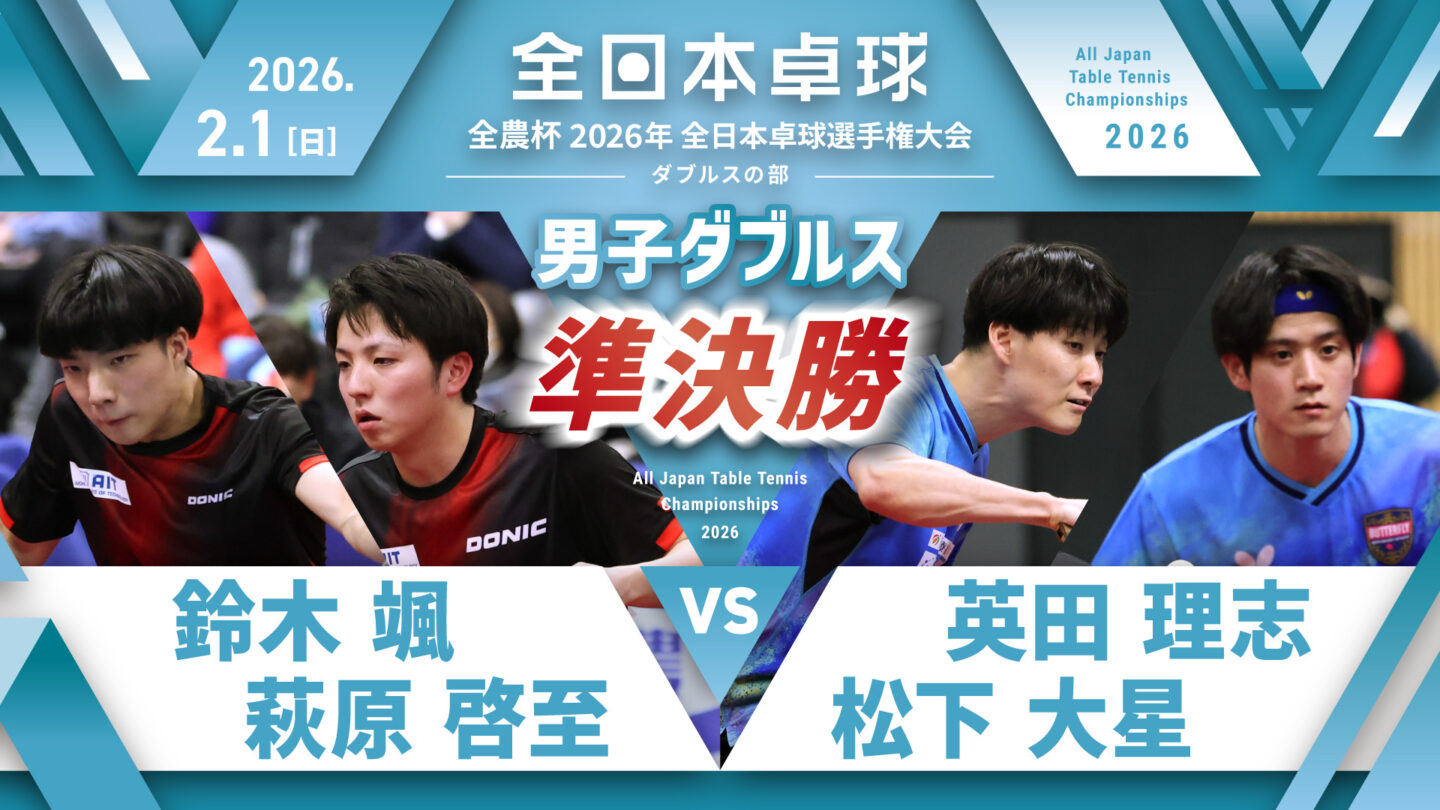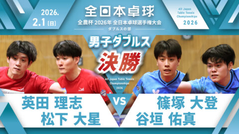 【見逃し配信】2026年全日本卓球選手権大会(ダブルスの部)【4日目:2/1】:男子ダブルス決勝 英田理志・松下大星 vs 篠塚大登・谷垣佑真(コート1)
