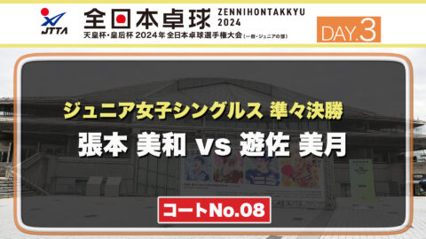 【見逃し配信】2024年全日本卓球選手権大会【3日目:1/24】:ジュニア女子準々決勝 張本 美和 vs 遊佐 美月(コートNo.08)