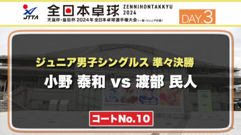 【見逃し配信】2024年全日本卓球選手権大会【3日目:1/24】:ジュニア男子準々決勝 小野 泰和 vs 渡部 民人(コートNo.10)