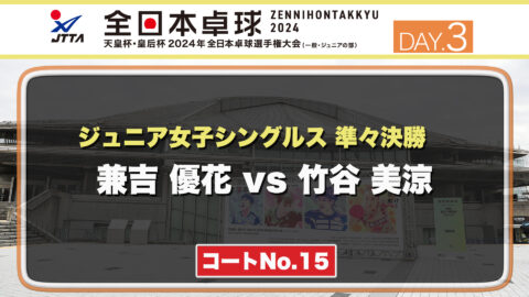 【見逃し配信】2024年全日本卓球選手権大会【3日目:1/24】:ジュニア女子準々決勝 兼吉 優花 vs 竹谷 美涼(コートNo.15)