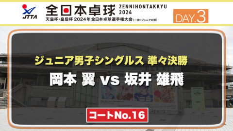 【見逃し配信】2024年全日本卓球選手権大会【3日目:1/24】:ジュニア男子準々決勝 岡本 翼 vs 坂井 雄飛(コートNo.16)