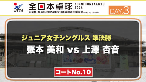 【見逃し配信】2024年全日本卓球選手権大会【3日目:1/24】:ジュニア女子準決勝 張本 美和 vs 上澤 杏音(コートNo.10)