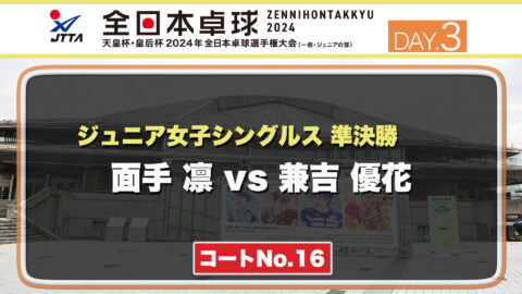 【見逃し配信】2024年全日本卓球選手権大会【3日目:1/24】:ジュニア女子準決勝 面手 凛 vs 兼吉 優花(コートNo.16)