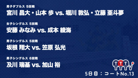 【見逃し配信】2023年全日本卓球選手権大会【5日目:1/27】:コートNo. 13 男子ダブルス|男女シングルス