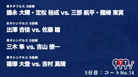 【見逃し配信】2023年全日本卓球選手権大会【5日目:1/27】:コートNo. 14 男子ダブルス|男女シングルス