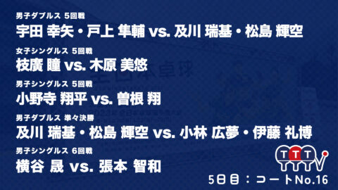【見逃し配信】2023年全日本卓球選手権大会【5日目:1/27】:コートNo. 16 男子ダブルス|男女シングルス