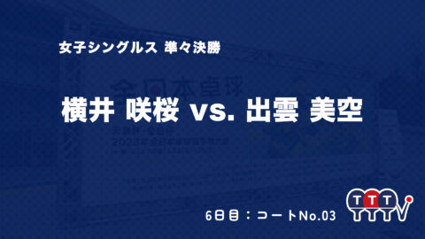 【見逃し配信】2023年全日本卓球選手権大会【6日目:1/28】:女子シングルス準々決勝 横井 咲桜 vs. 出雲 美空(コートNo.03)