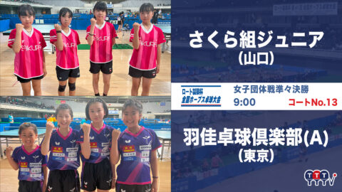 【見逃し配信】ロート製薬杯 第41回全国ホープス卓球大会:女子団体戦準々決勝(コートNo.13)<2023年8月13日(日)>