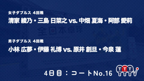 【見逃し配信】2023年全日本卓球選手権大会【4日目:1/26】:コートNo. 16 女子ダブルス&男子ダブルス(4回戦)