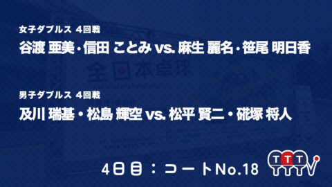【見逃し配信】2023年全日本卓球選手権大会【4日目:1/26】:コートNo. 18 女子ダブルス&男子ダブルス(4回戦)
