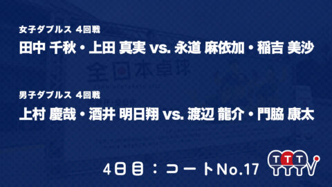 【見逃し配信】2023年全日本卓球選手権大会【4日目:1/26】:コートNo. 17 女子ダブルス&男子ダブルス(4回戦)