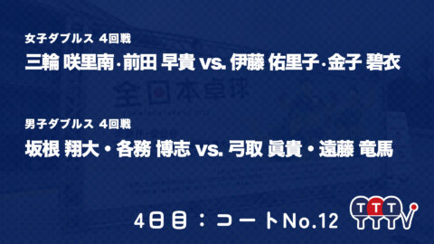 【見逃し配信】2023年全日本卓球選手権大会【4日目:1/26】:コートNo. 12 女子ダブルス&男子ダブルス(4回戦)