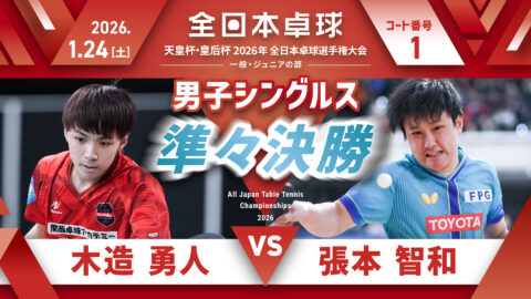 【見逃し配信】2026年全日本卓球選手権大会【5日目:1/24】:男子シングルス準々決勝 木造勇人 vs 張本智和(コートNo. 01)