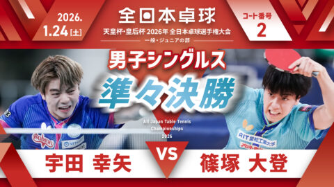 【見逃し配信】2026年全日本卓球選手権大会【5日目:1/24】:男子シングルス準々決勝 宇田幸矢 vs 篠塚大登(コートNo. 02)