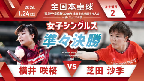 【見逃し配信】2026年全日本卓球選手権大会【5日目:1/24】:女子シングルス準々決勝 横井咲桜 vs 芝田沙季(コートNo. 02)