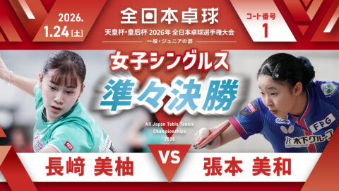 【見逃し配信】2026年全日本卓球選手権大会【5日目:1/24】:女子シングルス準々決勝 長﨑美柚 vs 張本美和(コートNo. 01)
