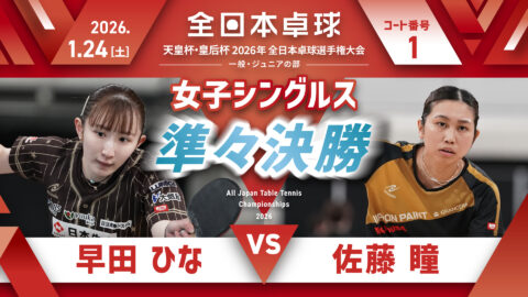 【見逃し配信】2026年全日本卓球選手権大会【5日目:1/24】:女子シングルス準々決勝 早田ひな vs 佐藤瞳(コートNo. 01)