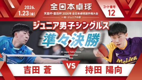 【見逃し配信】2026年全日本卓球選手権大会【4日目:1/23】:ジュニア男子準々決勝 吉田蒼 vs 持田陽向(コートNo. 12)