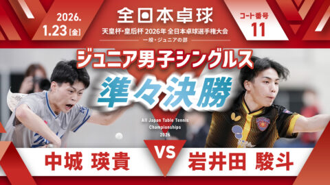 【見逃し配信】2026年全日本卓球選手権大会【4日目:1/23】:ジュニア男子準々決勝 中城瑛貴 vs 岩井田駿斗(コートNo. 11)