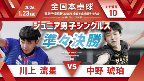 【見逃し配信】2026年全日本卓球選手権大会【4日目:1/23】:ジュニア男子準々決勝 川上流星 vs 中野琥珀(コートNo. 10)