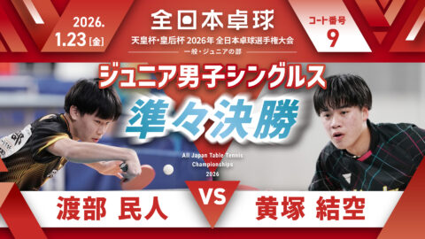 【見逃し配信】2026年全日本卓球選手権大会【4日目:1/23】:ジュニア男子準々決勝 渡部民人 vs 黄塚結空(コートNo. 09)