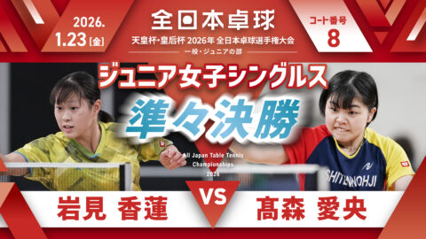 【見逃し配信】2026年全日本卓球選手権大会【4日目:1/23】:ジュニア女子準々決勝 岩見香蓮 vs 髙森愛央(コートNo. 08)