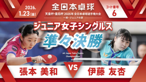 【見逃し配信】2026年全日本卓球選手権大会【4日目:1/23】:ジュニア女子準々決勝 張本美和 vs 伊藤友杏(コートNo. 06)