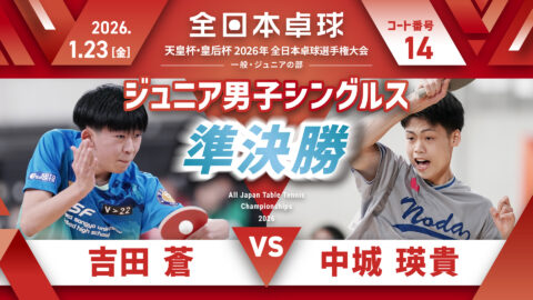 【見逃し配信】2026年全日本卓球選手権大会【4日目:1/23】:ジュニア男子準決勝 吉田蒼 vs 中城瑛貴(コートNo. 14)