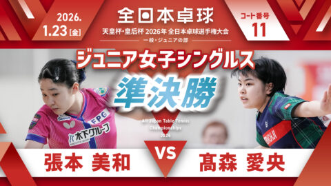 【見逃し配信】2026年全日本卓球選手権大会【4日目:1/23】:ジュニア女子準決勝 張本美和 vs 髙森愛央(コートNo. 11)