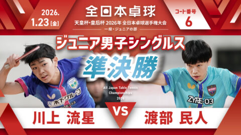 【見逃し配信】2026年全日本卓球選手権大会【4日目:1/23】:ジュニア男子準決勝 川上流星 vs 渡部民人(コートNo. 06)