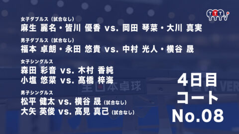 2022年全日本卓球選手権大会【4日目:1/27】:コートNo. 08<見逃し配信>