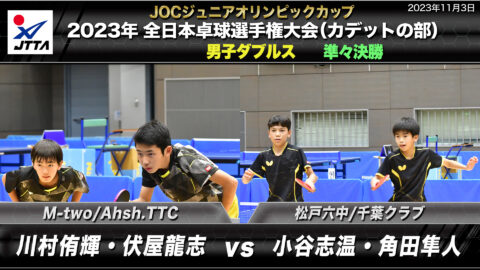 【男子ダブルス準々決勝】川村侑輝・伏屋龍志 vs 小谷志温・角田隼人|JOCジュニアオリンピックカップ 2023年全日本卓球選手権大会(カデットの部)