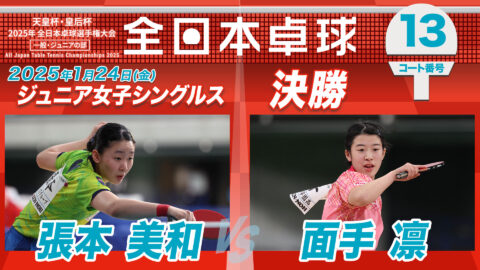 【見逃し配信】2025年全日本卓球選手権大会【4日目:1/24】:ジュニア女子決勝 張本美和 vs 面手凛(コートNo.13)