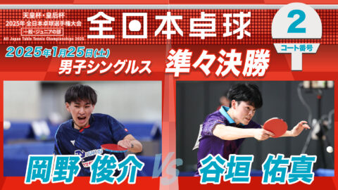 【見逃し配信】2025年全日本卓球選手権大会【5日目:1/25】:男子シングルス準々決勝 岡野俊介 vs 谷垣佑真(コートNo.02)