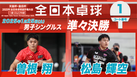 【見逃し配信】2025年全日本卓球選手権大会【5日目:1/25】:男子シングルス準々決勝 曽根翔 vs 松島輝空(コートNo.01)
