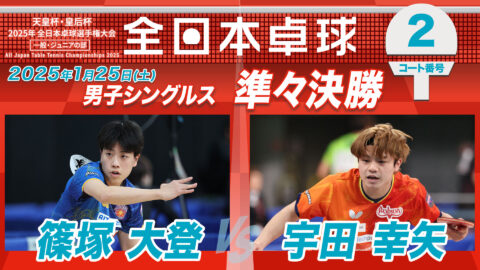 【見逃し配信】2025年全日本卓球選手権大会【5日目:1/25】:男子シングルス準々決勝 篠塚大登 vs 宇田幸矢(コートNo.02)