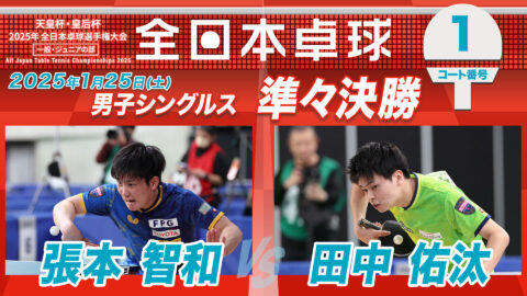 【見逃し配信】2025年全日本卓球選手権大会【5日目:1/25】:男子シングルス準々決勝 張本智和 vs 田中佑汰(コートNo.01)