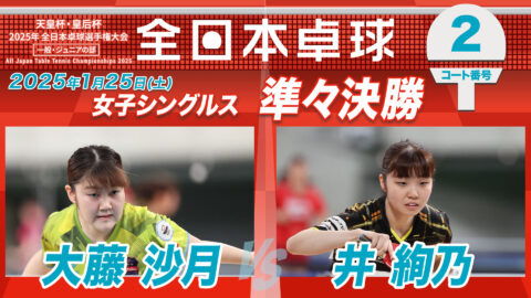 【見逃し配信】2025年全日本卓球選手権大会【5日目:1/25】:女子シングルス準々決勝 大藤沙月 vs 井絢乃(コートNo.02)