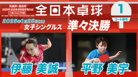 【見逃し配信】2025年全日本卓球選手権大会【5日目:1/25】:女子シングルス準々決勝 伊藤美誠 vs 平野美宇(コートNo.01)
