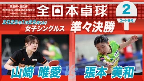 【見逃し配信】2025年全日本卓球選手権大会【5日目:1/25】:女子シングルス準々決勝 山﨑唯愛 vs 張本美和(コートNo.02)